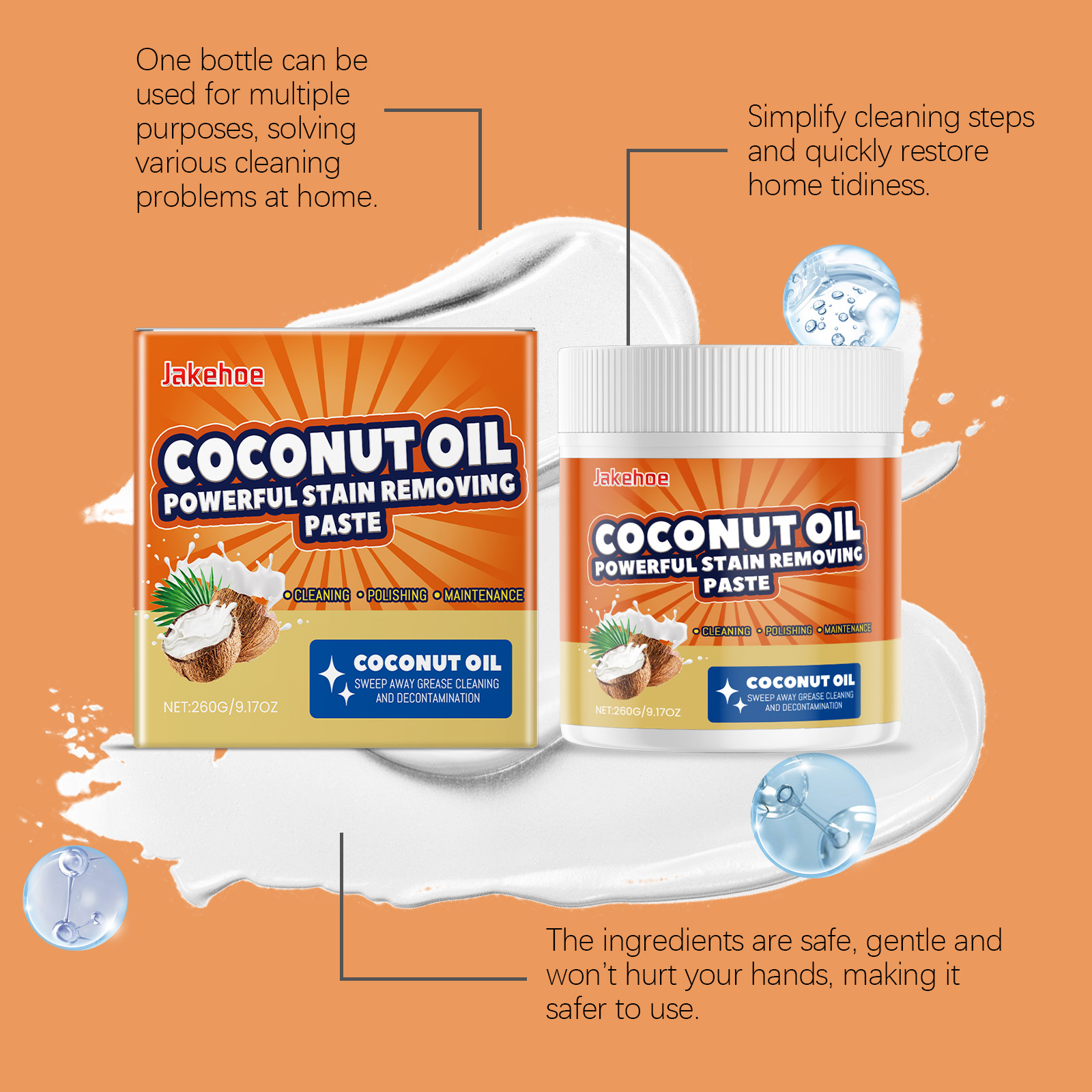 Our coconut oil stain remover contains coconut oil, disodium EDTA, and sodium bicarbonate. It forms a fine protective layer that effectively reduces dust adhesion, making the effect longer-lasting and fresher. After cleaning, the space will look brand new, without any pungent odor. It's easy to use: take an appropriate amount with a sponge and rub back and forth on the surface to be cleaned until the dirt disappears. Finally, rinse with water. It can quickly penetrate to the bottom of stains, effectively breaking down stubborn stains and easily removing them. Simplify cleaning steps and quickly restore your home to a clean state. Another coconut oil stain remover contains citric acid, disodium EDTA, and coconut oil. It can effectively remove stubborn grease stains and everyday dirt without leaving any dead spots. It's easy to use: take an appropriate amount and rub back and forth on the surface to be cleaned until the dirt disappears. Finally, rinse with water. It can clean and polish at the same time to enhance the shine of items.